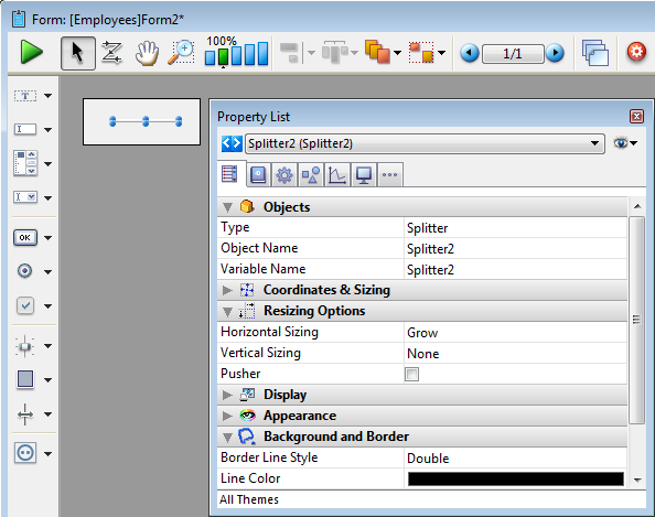 Adds a horizontal splitter to divide the form (or part of it) into two areas which can be resized respectively. Any dependent objects must be assigned appropriate resizing properties.