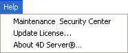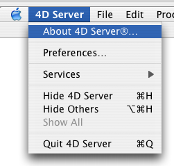The interface of the 4D Server application is made up of the following menus: File, Edit, Window, Help. Under Mac OS, certain commands are found in the 4D Server menu (application menu).