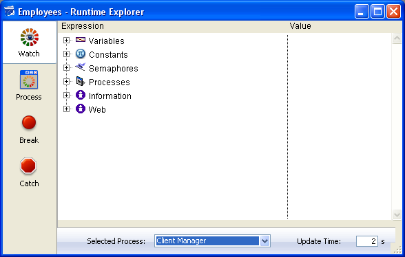 The Runtime Explorer window contains four pages that can be accessed by clicking on the following buttons: Watch, Process, Break and Catch. The Runtime Explorer works the same way in 4D Server and 4D. For more information, please refer to the 4D Design Reference manual (see chapter Runtime Explorer).