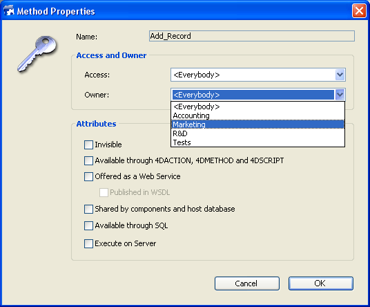 The following example shows “Owner” access rights for the Add_Record project method being assigned to a group. Groups can generally be assigned “Access” (use) and/or “Owner” (modification) access rights.