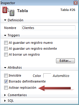 Para activar el mecanismo interno de replicación, debe utilizar en cada tabla (en la base remota y local), la propiedad de tabla Activar replicación accesible en el Inspector de tablas: