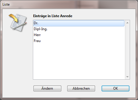 Sie wollen ein Feld zum Klassifizieren von Personen anlegen: Herr, Frau, aber auch Dr., Ing., Dipl-Ing., etc. Dafür erstellen Sie ein Feld vom Typ Lange Ganzzahl mit Namen "Anrede", definieren eine Auswahlliste (genannt "Anreden") mit den möglichen Titeln und weisen sie dem Feld zu.