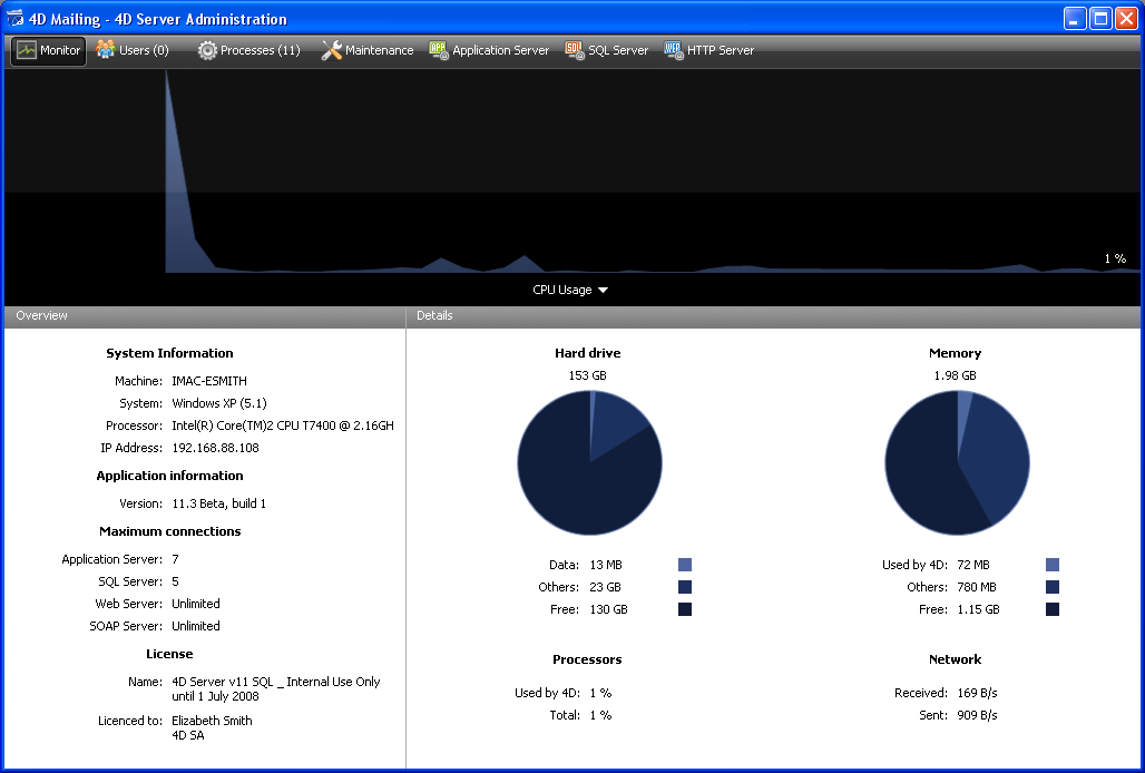 • Administração centralizada em linha, gráfica: A janela de administração de 4D Server exibe automaticamente informações importantes relacionadas com a atividade do aplicativo: total memória atribuída para o 4D Server, os dados em cachê, número e nome de usuários conectados, número de processos e o estado de cada um, monitoramento de backups e solicitações e atividade dos servidores.