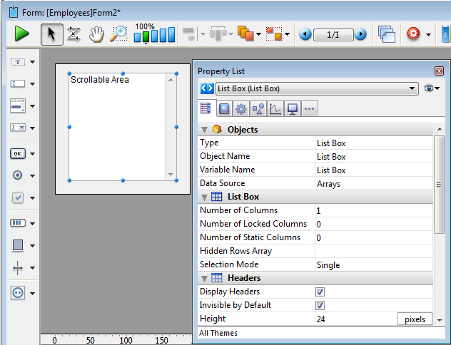 Adiciona uma área de rolagem que consiste em uma list box de uma só coluna cujos cabeçalhos e rodapés não são mostrados. Esta área não é editável normalmente,  mas pode ser configurada utilizando a lista de propriedades.