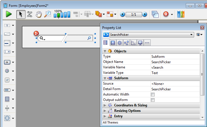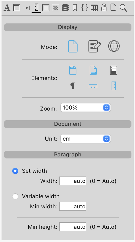 • Como padrão, o subformulário 4D Write Pro Widget é mostrado com 9 ícones. Ao selecionar cada ícone, se mostra um painel de controle diferente: