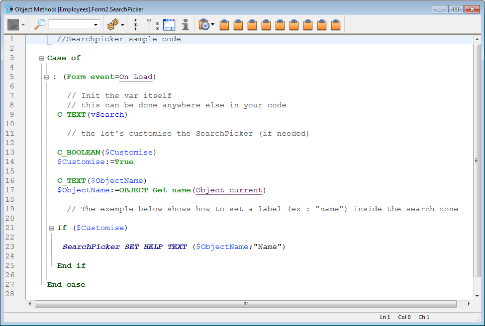 Pode modificar o código de exemplo no método de objeto com o objetivo de personalizar a etiqueta mostrada nesta área mediante o comando SearchPicker SET HELP TEXT.
