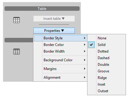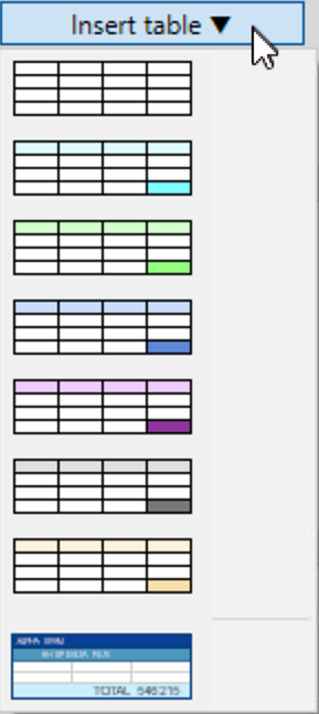 Em Inserir tabela pode escolher entre uma das tabelas modelo propostas e modificá-la mediante o menu de propriedades, ou escolher a tabela Assistente que aparece ao final da lista para simplificar ainda mais o processo de criação de tabelas. Consulte a documentação do Assistente de tabelas para obter mais detalhes.