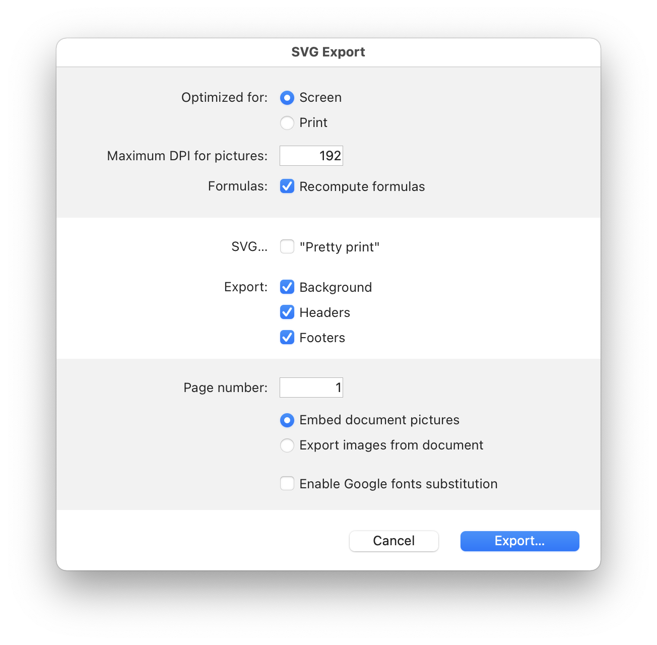 Os comandos de exportação PDF, HTML e HTML Mime mostram um quadro de diálogo Opções de exportação, que permite selecionar opções de exportação. Por exemplo, aqui está o quadro de diálogo de opções para a exportação de PDF: