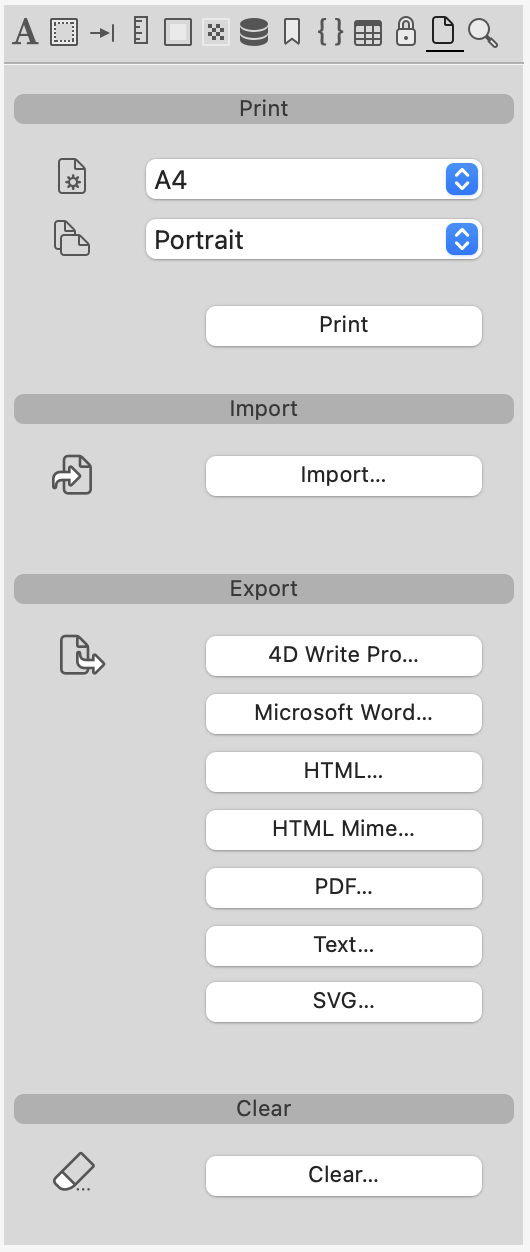 • botões Exportar: permite exportar o conteúdo da área 4D Write Pro em vários formatos.