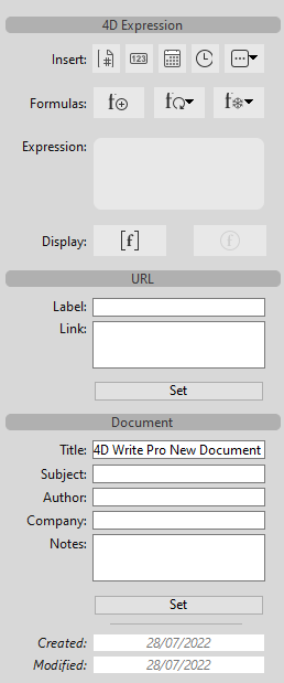 Este painel insere e administra as expressões 4D e as URLs  na área 4D Write Pro e inclui uma área para a introdução de informação útil sobre o documento.