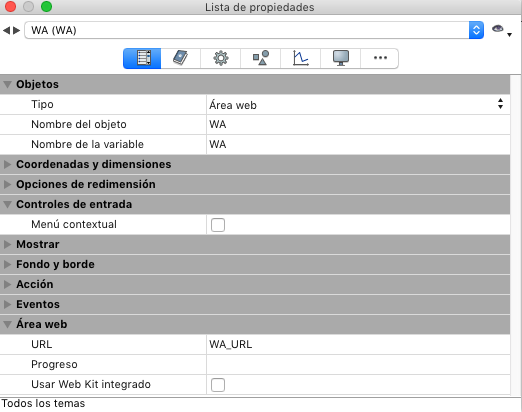 Dos variables específicas están automáticamente asociadas a cada área web: “URL” y “Progreso” Estas variables permiten controlar respectivamente el URL mostrado por el área web y el porcentaje de carga de la página mostrada en el área web. Por defecto, estas variables se llaman, respectivamente, nomArea_url y nomArea_progress. Puede cambiar estos nombres si lo prefiere.