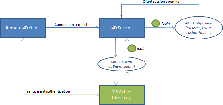 La implementación de SSO en sus soluciones 4D permitirá a los usuarios acceder a la aplicación 4D en Windows sin tener que volver a introducir su contraseña cuando ya están registrados en el dominio Windows de su empresa (utilizando Active Directory). Detrás, la aplicación 4D Server puede tener acceso a la autenticación de inicio de sesión de Windows, que se puede utilizar para iniciar la sesión del usuario 4D