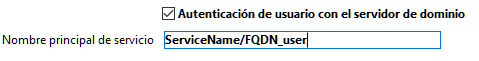 Esta opción declara el SPN tal como se establece en la configuración Active Directory. Un nombre principal de servicio es un identificador único de una instancia de servicio. Los SPNs son utilizados por la autenticación Kerberos para asociar una instancia de servicio con una cuenta de servicio de inicio de sesión. Esto permite que una aplicación cliente solicite que el servicio autentique una cuenta incluso si el cliente no tiene el nombre de la cuenta. Para más información, por favor consulte la página SPN en el sitio web de msdn.
