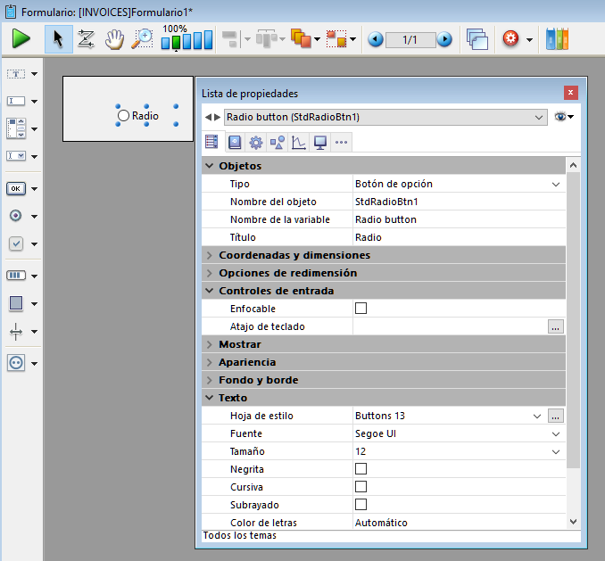 Añade un botón de radio básico. Puede utilizar la lista de propiedades para modificar sus propiedades.