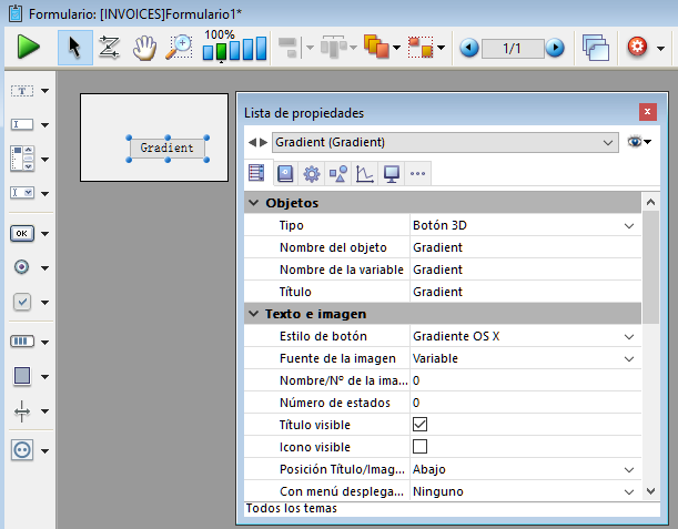 Añade un botón gradiente 3D cuyo aspecto ha sido preformateado. Puede utilizar la lista de propiedades para modificar sus propiedades.