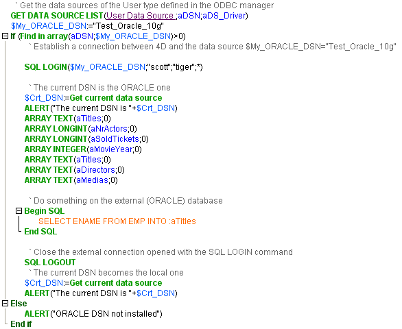 O seguinte exemplo mostra como conectar-se a uma fonte de dados externa (ORACLE), como obter dados da base ORACLE, e depois como desconectar-se da base ORACLE e voltar a base local.