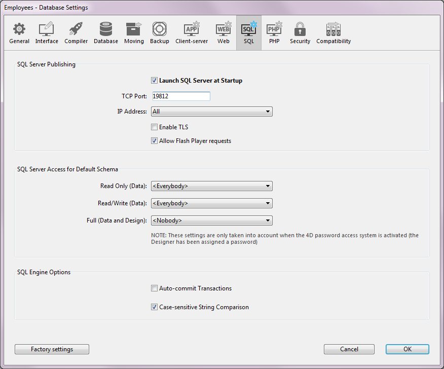 Note: An additional security option can be set at the level of each 4D project method. For more information, please refer to the "Available through SQL option" paragraph in the Principles for integrating 4D and the 4D SQL engine section.