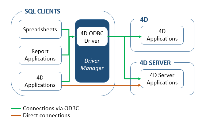 Connections via ODBC: 4D provides an ODBC driver that allows any third-party application (Excel® type spreadsheet, other DBMS, and so on) or another 4D application to connection to the 4D SQL server. The 4D ODBC driver must be installed on the SQL Client machine. The installation and configuration of the 4D ODBC driver is detailed in a separate manual.