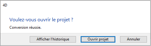 Ouvrir projet : redémarre l'application 4D et charge le projet converti.