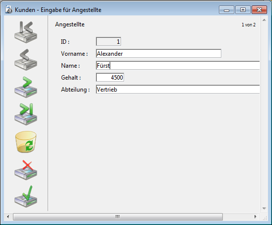 Haben Sie den letzten Datensatz eingegeben, klicken Sie auf Abbrechen (Icon mit Kreuz am linken Rand), um das neue Leerformular zu annullieren. 4D Server kehrt zum Ausgabeformular zurück.