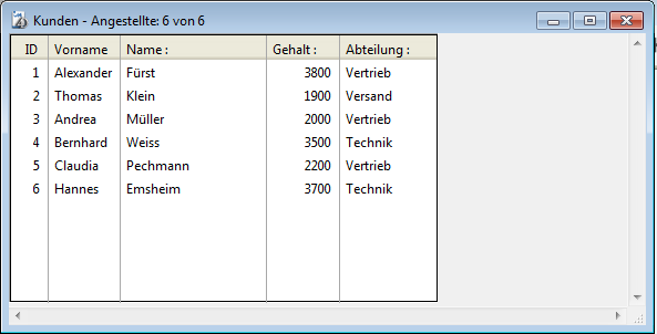 5. Werden nicht alle sechs Datensätze angezeigt, wählen Sie im Menü Datensätze den Befehl Alle anzeigen und passen das Fenster bzw. die Spalten bei Bedarf an.
