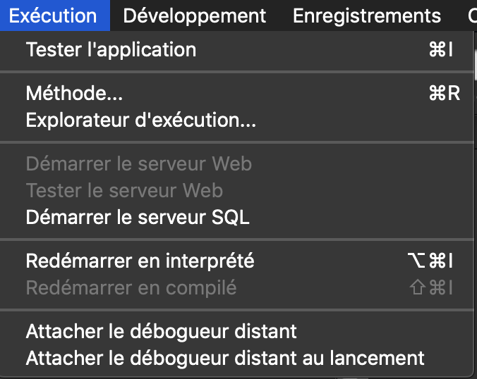 Menu Exécuter de 4D Developer (distant)