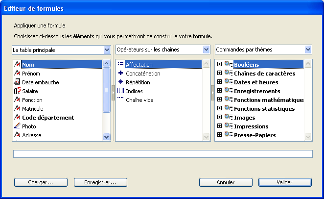 L’éditeur de formules vous permet d’écrire facilement vos instructions. Il vous suffit de cliquer sur les noms de champs, les opérateurs et les fonctions 4D ainsi que, éventuellement, les méthodes projet pour les inscrire dans la formule. Lorsque vous cliquez sur un élément, il s’affiche automatiquement dans la zone d’édition, où vous pouvez ensuite le modifier à l’aide des fonctions standard de couper/copier/coller. Vous pouvez aussi taper directement les éléments dans la zone d’édition ou procéder par glisser-déposer depuis les listes d’éléments.