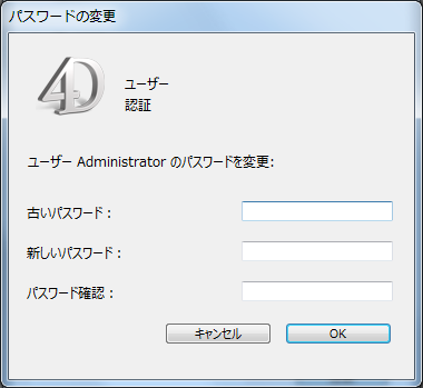 パスワードを変更するにはまず現在のパスワードを"古いパスワード"欄に入力します。そして新しいパスワードを"新しいパスワード"と"パスワード確認"欄に入力します。ダイアログを確定すると、入力が正しければ、パスワードが変更されます。ユーザーは新しいパスワードを入力して接続ボタンをクリックし、データベースに接続します。