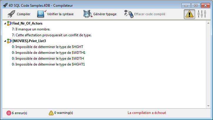 La fenêtre du compilateur permet de lancer la compilation de la base ou d’effectuer une vérification de la syntaxe des méthodes. En outre, des boutons permettent de générer/regénérer les méthodes de typage pour la base, d’effacer le code compilé, d’afficher ou de masquer les warnings et d’accéder directement aux Propriétés de la base.