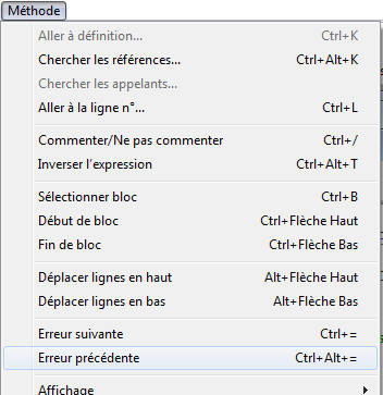 Le bouton Vérifier la syntaxe provoque l’exécution de la phase de vérification de syntaxe. A l’issue de la vérification, les éventuelles erreurs détectées sont listées dans la zone d’informations. Il est alors possible de double-cliquer sur une ligne d’erreur afin d’afficher la méthode correspondante.