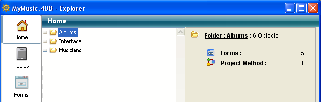 All customized database objects (i.e. tables, forms, project methods) are always displayed on the Home page. Note that they remain listed on the other pages of the Explorer as well.