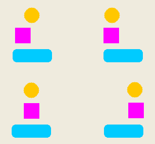 When 4D aligns objects, it leaves one selected object in place and aligns the remaining objects to that one. This object is the “anchor.” It uses the object that is the furthest in the alignment’s direction as the anchor and aligns the other objects to that object. For instance, if you want to perform a right alignment on a set of objects, the rightmost object will be used as the anchor. The figure below shows objects with no alignment, "aligned left", "aligned horizontally by centers", and "aligned right":