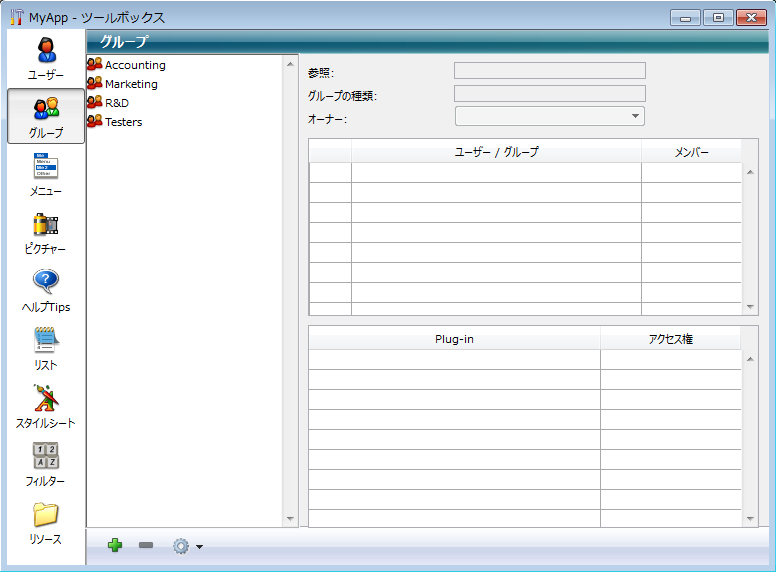グループエディターを使用して、各グループ内に納める要素(ユーザーや他のグループ)を設定したり、プラグインへのアクセス権を割り当てることができます。グループを作成する際、ユーザーのなかからグループのオーナーを指定することができます。