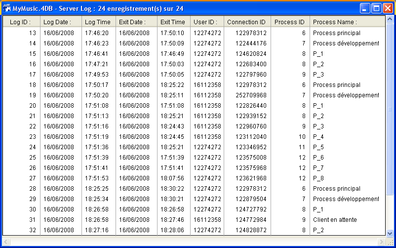次の例はOn Server Open ConnectionデータベースメソッドとOn Server Close Connection データベースメソッドを使用して、データベースへの接続ログを管理する方法を示しています。[Server Log]テーブル (下図) は接続処理の記録を取るために使用されています: