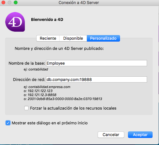 Nota: este parámetro no se tiene en cuenta en las aplicaciones cliente-servidor personalizadas. En teoría, la aplicación cliente se conecta directamente a la aplicación servidor, sin pasar por la caja de diálogo de conexión. Sin embargo, en caso de error, esta caja de diálogo aparecerá, en este caso, el nombre de publicación de la aplicación servidor es el nombre de la base compilada.