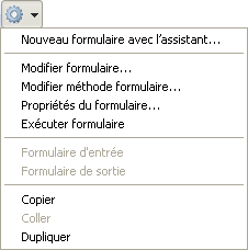 4D vous permet de copier/coller ou de dupliquer un formulaire existant, via les commandes correspondantes du menu contextuel ou dans le menu d’options de la page. Ce principe permet de développer rapidement plusieurs formulaires ayant des caractéristiques communes.