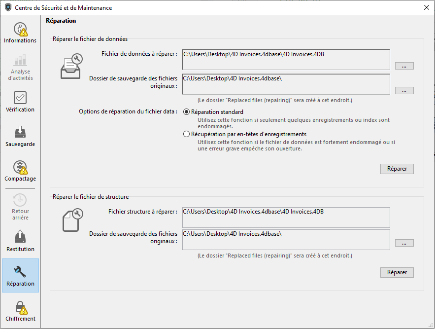 Cette page permet de réparer le fichier de données ou le fichier de structure lorsqu’il a été endommagé. Généralement, vous n’utiliserez ces fonctions qu’à la demande de 4D, lorsque des anomalies auront été détectées à l’ouverture de la base ou à la suite d’une vérification (cf section Page Vérification).