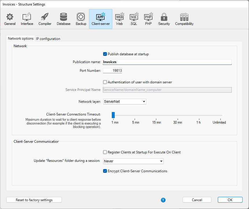 Pode definir diferentes parâmetros relativos a rede e a comunicação cliente-servidor na guia "Opções rede" da página Cliente-Servidor das Propriedades do banco de dados (acessíveis desde 4D em modo remoto e 4D Server):