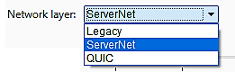 Esta caixa suspensa contém três opções de capa de rede para manejar as comunicações entre 4D Server e as máquinas 4D remotas (clientes): Legacy, ServerNet (por padrão) e QUIC (só em modo projeto),