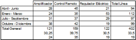 Este modo le permite mostrar su informe como una tabla de dos dimensiones. Es útil cuando se desea mostrar los datos de una fuente de datos desglosados en categorías que son en realidad una función de otras dos fuentes de datos. Por ejemplo, un formulario tablas cruzada permitirá mostrar, en una tabla, cuántos de cada tipo de producto se vendieron en cada trimestre. La siguiente es un informe rápido típico de tipo tabla cruzada: