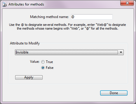 In the “Attribute to Modify” area, choose an attribute from the drop-down list, then click on the True or False radio button corresponding to the value to be applied. Note: If the “Published in WSDL” attribute is set to True, it will only be applied to project methods already containing the “Offered as a Web Service” attribute.
