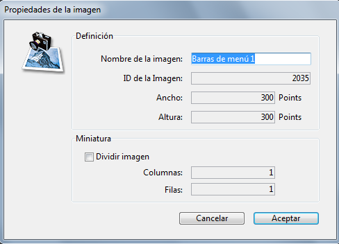 • ID de la imagen: número de ID único para la imagen. Este es el número de referencia de la imagen que utiliza cuando crea botones imagen, menús imagen desplegables, barras de herramientas personalizadas, listas o cuando maneja las imágenes de la librería por programación.