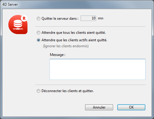 - Dans tous les cas, si aucun client n'est connecté au serveur au moment où la fenêtre de fermeture est validée, 4D Server quitte immédiatement.