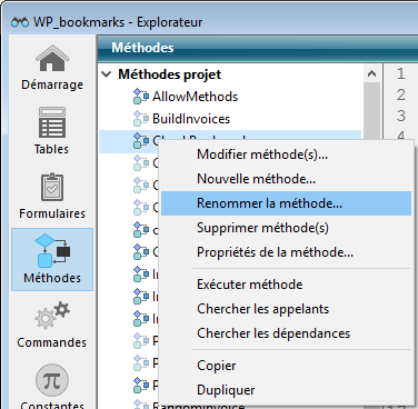 4D propose une fonction de renommage des méthodes projet et des variables avec propagation dans toute la base. Cette fonction est accessible :