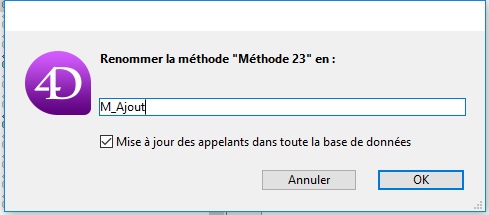 • Méthode projet : l’option Mise à jour des appelants dans toute la base de données permet de propager le renommage de la méthode dans tous les objets de la base qui la référencent. Vous pouvez également désélectionner cette option pour, par exemple, renommer une méthode uniquement au niveau de l’Explorateur.