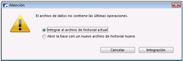 Si no ha seleccionado la opción de integración automática del archivo de historial (ver Integración sucesiva de varios archivos de historial), aparece una caja de diálogo de alerta durante la apertura de la base cuando 4D constata que el archivo de historial contiene más operaciones de las que se han efectuado en la base.