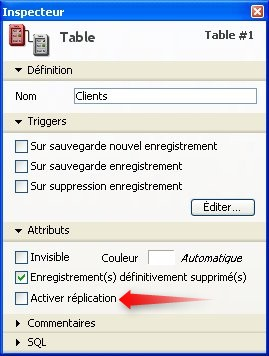 Pour activer le mécanisme interne de réplication, vous devez utiliser dans chaque table (côté base distante et côté base locale) la propriété de table Activer réplication, accessible dans l’Inspecteur des tables :