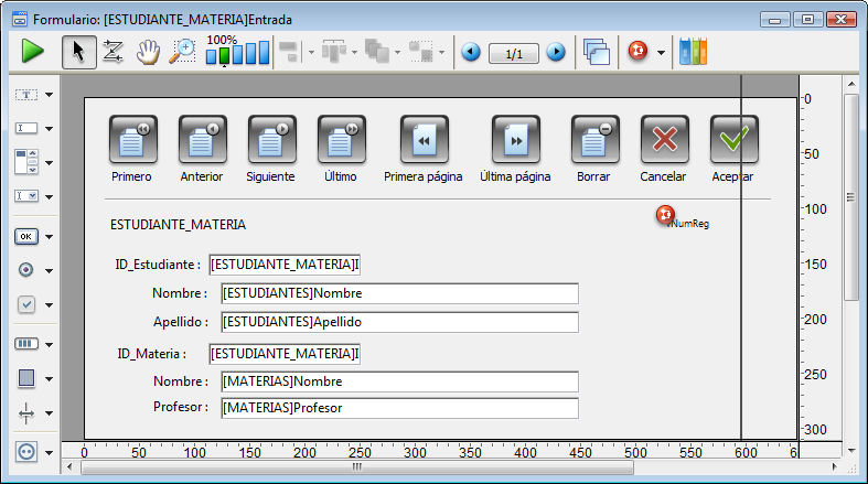 El formulario de entrada para este registro se muestra a continuación. Note que contiene campos de las tablas [ESTUDIANTES] y [MATERIAS].