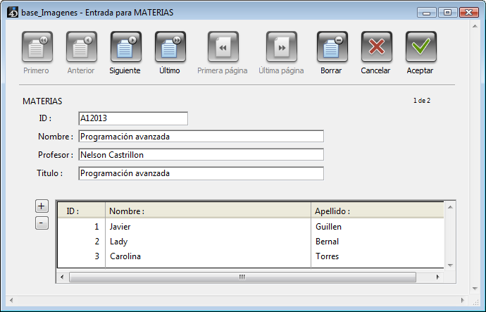 El registro de la imagen anterior está en la tabla [ESTUDIANTES]. Se muestra la información del estudiante en la parte superior y el subformulario en la parte inferior muestra la información de las materias que ha inscrito, traída de la tabla [ESTUDIANTE_MATERIA].