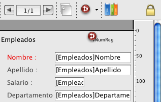 En la primera máquina, seleccione la etiqueta "Apellido" a la izquierda del campo [Empleados]Nombre. Seleccione en el menú jerárquico Objeto>Color.  Vuelve rojo el color de este objeto.